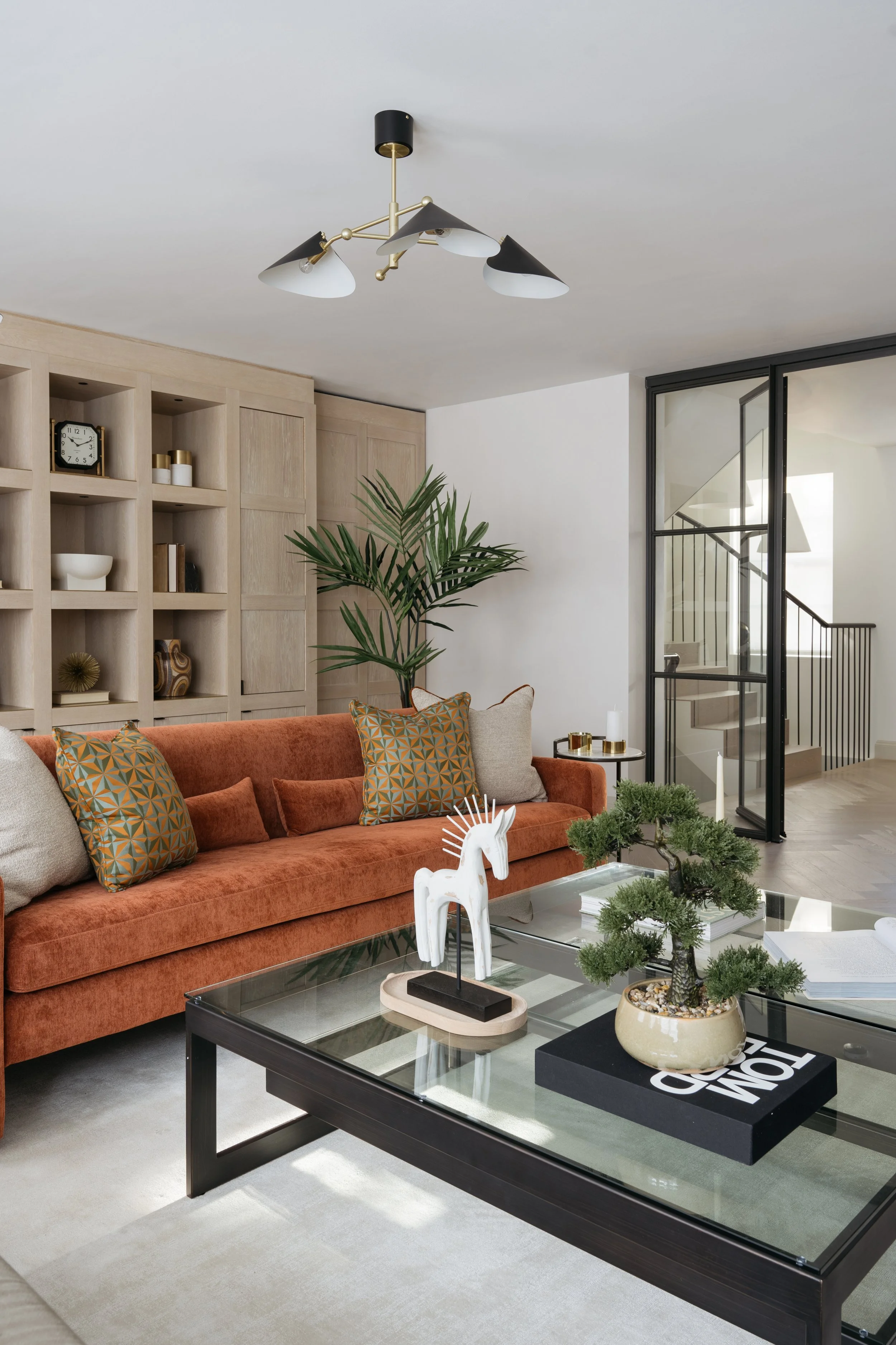 Walking straight into the main living area, you are greeted by an array of colour and art. Flickers of gold in lamps and white art give a rich and opulent feel to the space. The pops of colour contrast this in a pleasing way, using earthy orange and mustard tones. A welcoming environment is created through this design scheme, edging towards warm, rustic, and autumnal furnishings. Perfect for a new family, looking to find their cosy home.