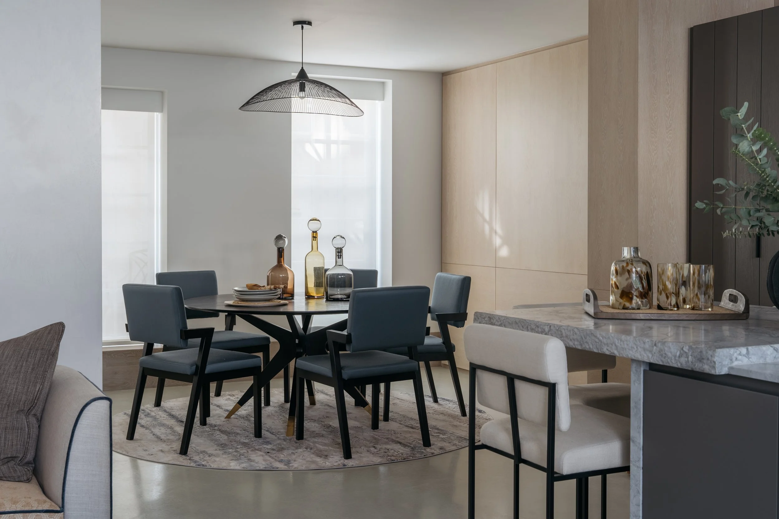 “The high-end finishes throughout this property were breath-taking in every room. We particularly loved the polished concrete used on the centre wall leading to the lower ground floor where you enter a beautiful open plan kitchen and dining space. The natural finishes continue to the wood panelled walls and bronzed colour kitchen paired with a natural stone. A dining table to host 6 as well as a seating area are perfectly zoned by the use of area rugs. We used a neutral colour palette in here with pops of burnt orange and mustard to compliment the warm details in the property finishes.”