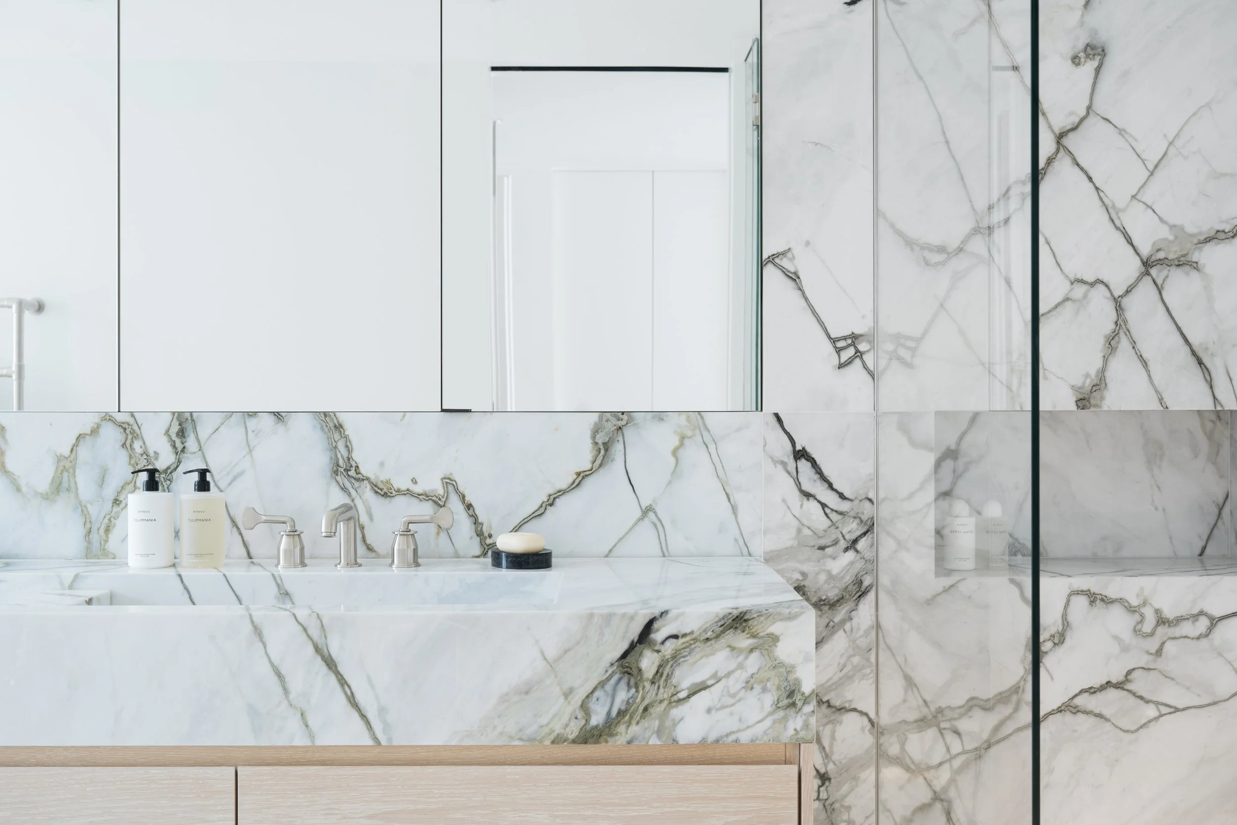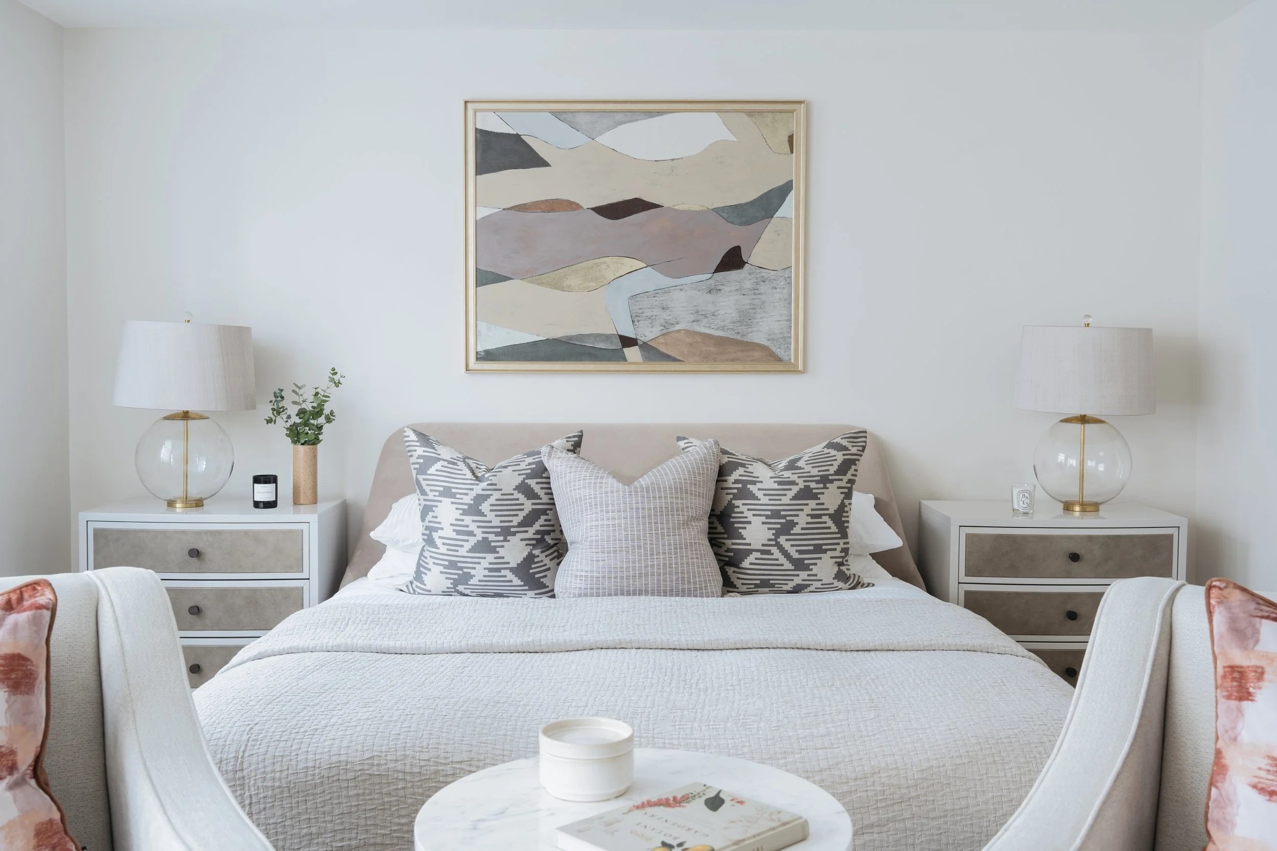 The principal bedroom is a peaceful haven for anyone looking to wind down after a long day. Escaping a busy city life, to this calming, neutral bedroom, will give them the relaxation they need. The designers brought the room cohesively together through sophisticated interior styling, including the complementing accents of lilac, as seen in the wall art.