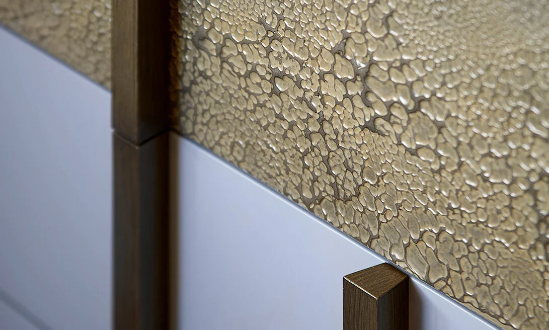 Accouter developed this one of kind bedside cabinet within the show home interior design project at The Chelsea Waterfront Development. The bespoke designed cabinet uses a combination of materials: Lacquer, Specialist Liquid metal finishes and Antique Brass handle details. Accouter’s aim was to create a piece of furniture which was not only discerning but functional providing two-drawer storage with a unique pull handle detail. Ultimately creating the high-end hotel feel the client had requested.